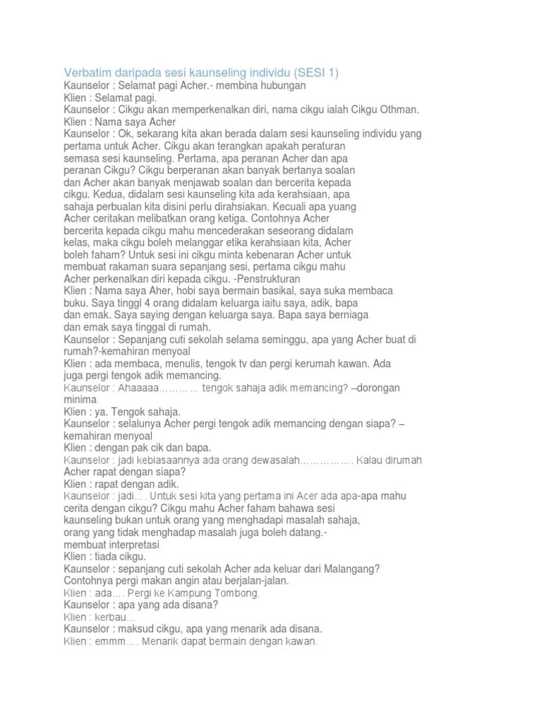 Lampiran dialog sesi kaunseling sesi kaunseling (1) tarikh : Kaunselor membina hubungan yang tulen, mesra, tidak menghukum, menerima. Laporan sesi kaunseling individu tape 5 pdf from imgv2 1 f.scribdassets contoh skrip sesi . Apa yang diperkatakan dalam sesi ini akan saya rahsiakan. Ok, sekarang kita akan berada dalam sesi kaunseling individu yang pertama untuk acher. Cikgu akan terangkan apakah peraturan